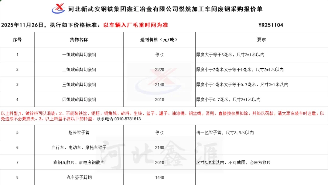 各位鋼友,為了你們切身利益,也為了我公司的經(jīng)營聲譽,切勿通過鋼販子出售廢鋼,鋼販子隨意扣雜,隨意欠你們貨款,給您們造成的經(jīng)濟損失,本公司不承擔任何責任也不提供任何保證,只有面對我公司出售,你們的利益才能最大化,經(jīng)濟才能不受損失。望各位鋼友明事理,懂道理,維護好自己的利益!